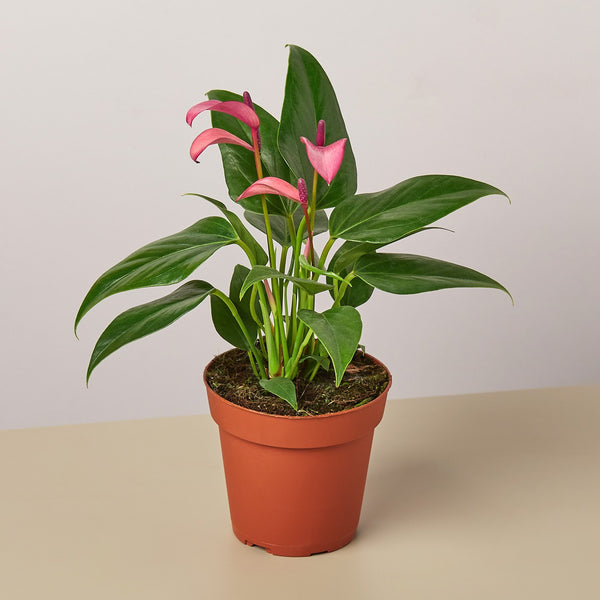 These exotic houseplants have glossy heart-shaped leaves with a beautiful bloom that comes in a large array of colors. They can bloom all year long with enough light and water. The Anthurium originated in the South American rain forest so they thrive in high-humidity environments with a decent amount of shade.